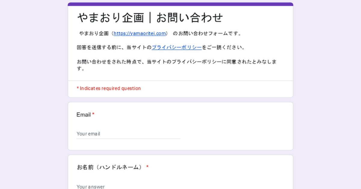 やまおり企画() のお問い合わせフォームです。回答を送信する前に、当サイトのプライバシーポリシーをご一読ください。 お問い合わせをされた時点で、当サイトのプライバシーポリシーに同意されたとみなします。