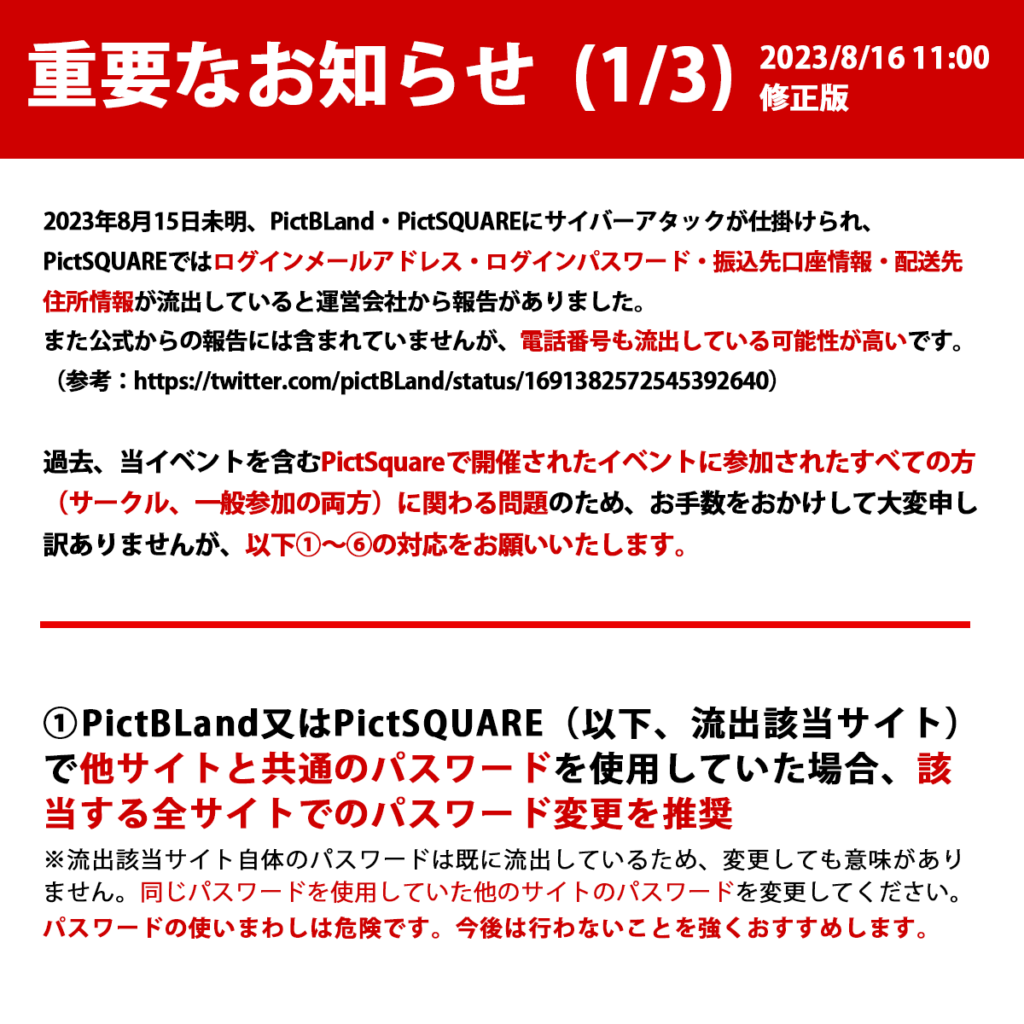 2023/8/17 復旧の見込みと参加キャンセルの窓口などについて追記*pictSQUARE公式HPへのURLを追記