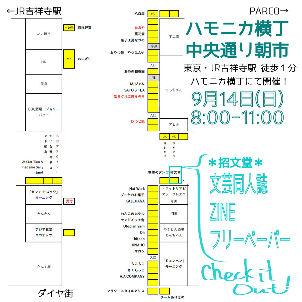 2020年9月より吉祥寺駅前のハモニカ横丁中央通りで開始された朝市です。テーマは 「ニギワイと新しい横丁のイメージづくり」です。小規模事業者を中心に50店舗近くが出店します。