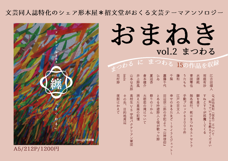 文芸同人誌のシェア型本屋・招文堂の内外から「おまねき」した、15名の作者さんによるアンソロジー!
