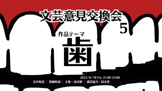 アーカイブ掲載|文芸意見交換会5_開催レポート 2023/8/18(金)の夜に招文堂Twitterスペースにて「文芸意見交換会5」が開催されました。主催は招文堂に棚を持つ、店主・花村渺さん。いつもは3〜4人で開催されるこの会ですが、今回は花村渺さんと招文堂・主催のやまおり亭、二人が作品を... 2026.01.15