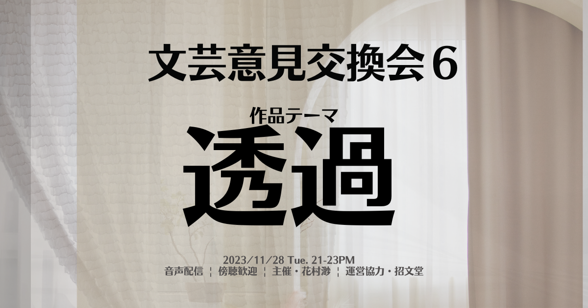 アーカイブ掲載|文芸意見交換会6_テーマ・透過|開催・2023/11/28 招文堂店主・花村渺さん主催の文芸意見交換会!指定のテーマにそって書かれた自作の新作を持ち寄り、読み合い、作品をよりよくするための意見交換・検討をする会です。日時 2023/11/28(火)21時〜23時 作品提出〆切 2023/11/21(... 2026.01.15
