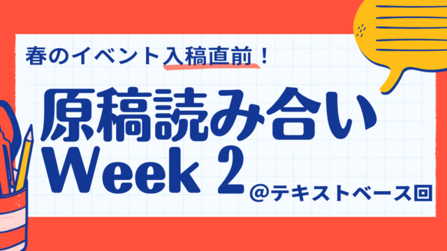 【募集終了】春のイベント入稿直前!原稿読み合いWeek2 春のコンテスト出品や同人誌入稿に向け、作品のクオリティアップを目指したいあなたへおくるオンライン文芸ワークショップ!作品を持ち寄り、読み合い、コメントや感想を交換することで、それぞれの原稿をさらにブラッシュアップ。ついでに誤字脱字も(可能な... 2026.01.15