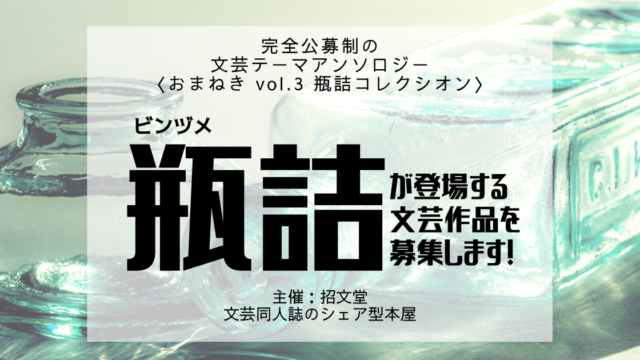 【募集終了】文芸テーマアンソロジー『おまねき vol.3 瓶詰コレクシオン』作品募集 文芸同人誌のちいさなシェア型本屋・招文堂がつくる、 ちいさな文芸テーマアンソロジー。vol.3は『瓶詰ビンヅメコレクシオン』と題し、「瓶詰」が登場する文芸作品を募集いたします。※文学フリマ東京39(2024/12/1)、もしくは日程の近い同... 2026.01.15