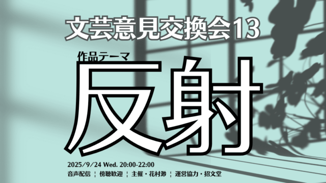アーカイブ掲載|文芸意見交換会13_テーマ・反射 招文堂店主・花村渺さん主催の文芸意見交換会!指定のテーマにそって書かれた自作の新作を持ち寄り、読み合い、作品をよりよくするための意見交換・検討をする会です。日時 9/24(水) 20時〜22時作品提出〆切 9/17(水) 22時会場 招文堂... 2026.01.15