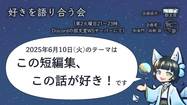 アーカイブあり|好きを語り合う会「この短編集、この話が好き!」 〈旅人ノ夢〉店主・和条門尚樹(わじょうもん なおき)さん主催のオンラインワークショップ、好きを語り合う会。和条門尚樹Discordのサーバーに集まり、トークテーマにそってお喋りしましょう!6月のトークテーマは「この短編集、この話が好き!」で... 2026.01.15