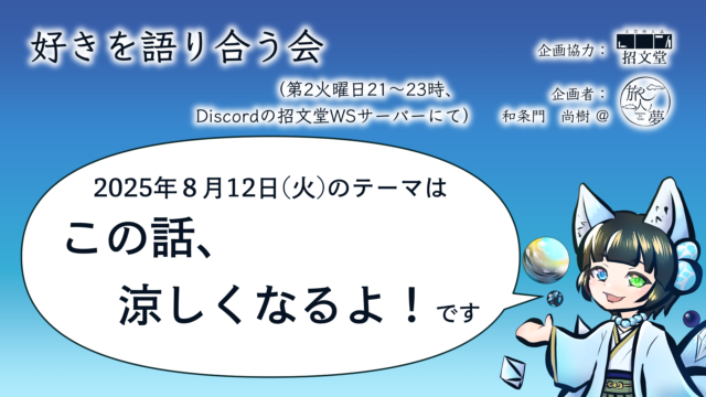 募集終了|好きを語り合う会「この話、涼しくなるよ!」 〈旅人ノ夢〉店主・和条門尚樹(わじょうもん なおき)さん主催のオンラインワークショップ、好きを語り合う会。和条門尚樹Discordのサーバーに集まり、トークテーマにそってお喋りしましょう!8月のトークテーマは「この話、涼しくなるよ!」です!... 2026.01.15