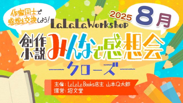 アーカイブ公開中|創作小説!みんなで感想会・七月-オープン- 自作小説を持ち寄り、読み合って感想を交換する文芸ワークショップ!主催は招文堂内、「LaLaLa Books」の店主・山本Q太郎さんです。山本Q太郎小説を書いていて思った「気軽に第三者の意見が貰えたらいいのに」を解決できないか考えてみました。... 2026.01.15