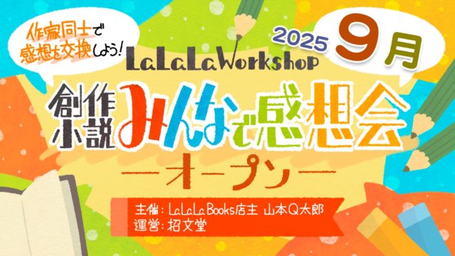 募集終了|創作小説!みんなで感想会・九月-オープン- 自作小説を持ち寄り、読み合って感想を交換する文芸ワークショップ!主催は招文堂内、「LaLaLa Books」の店主・山本Q太郎さんです。山本Q太郎小説を書いていて思った「気軽に第三者の意見が貰えたらいいのに」を解決できないか考えてみました。... 2026.01.15