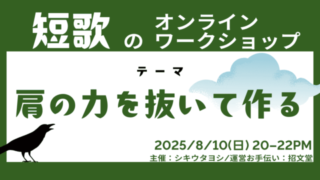 募集終了|「肩の力を抜いて作る」短歌オンラインワークショップ 招文堂に棚を持つ店主・シキウタヨシさんが主催するオンライン短歌ワークショップ!ウタヨシ「短歌の作り方がわからない」という方や、「短歌って古文の延長じゃないの」と思っていらっしゃる方へ向けた会です。みんなで集まって、実際に短歌を作りましょう!... 2026.01.15