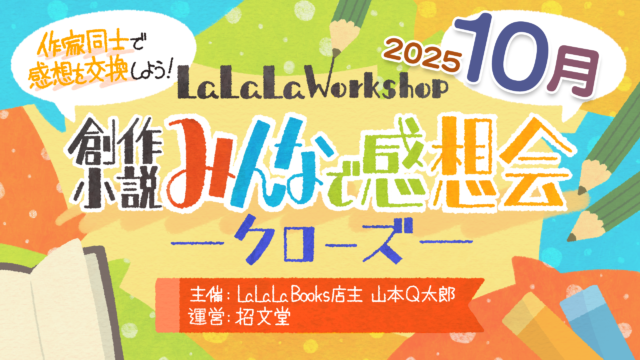 未分類 募集終了|創作小説!みんなで感想会・10月-クローズ- 自作小説の感想を交換する文芸ワークショップ!主催は招文堂内本屋「LaLaLa Books」山本Q太郎さんです。山本Q太郎「創作小説!みんなで感想会」は小説を書く人(2~4名)が一次創作の小説を持ち寄って、作品の感想を交換しあうワークショップ... 2026.01.15 未分類