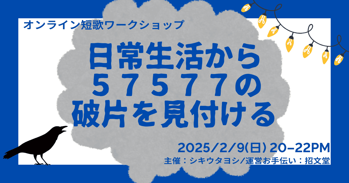 「あ、これ57だな」「これ下の句だな」など、日常生活から短歌の破片を拾えるようになるためのワークショップです。 可能であれば、簡単な短歌の組み立ても。