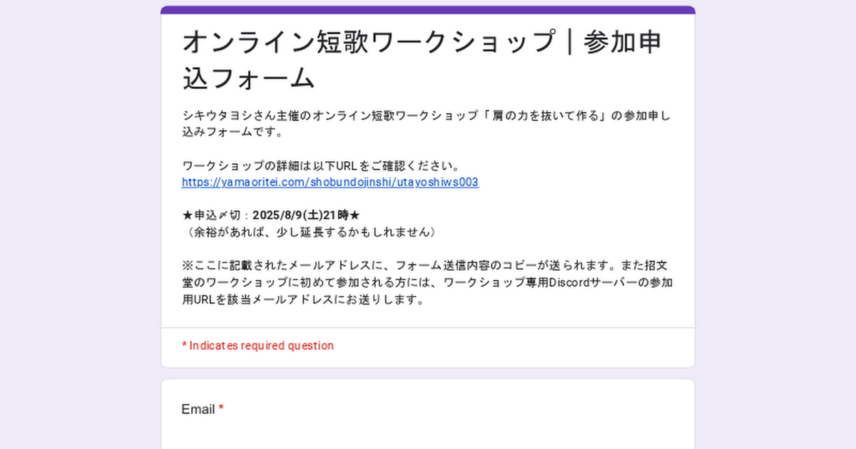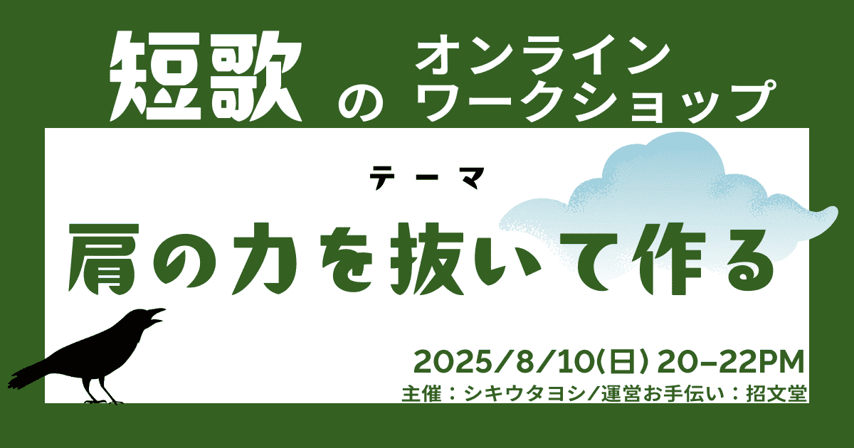 シキウタヨシさん主催のオンライン短歌ワークショップ「 肩の力を抜いて作る」の参加申し込みフォームです。ワークショップの詳細は以下URLをご確認ください。★申込〆切:2025/8/9(土)21時★(余裕があれば、少し延長するかもしれません)※...
