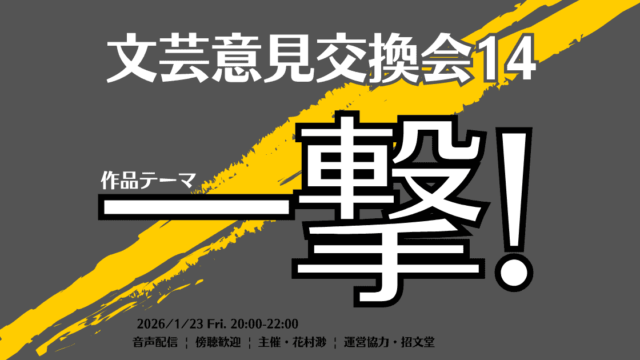 募集中|文芸意見交換会14_テーマ・一撃! 招文堂店主・花村渺さん主催の文芸意見交換会!指定のテーマにそって書かれた自作の新作を持ち寄り、読み合い、作品をよりよくするための意見交換・検討をする会です。日時 1/23(金) 20時〜22時作品提出〆切 1/16(金) 22時会場 招文堂... 2025.12.18 イベント募集花村渺